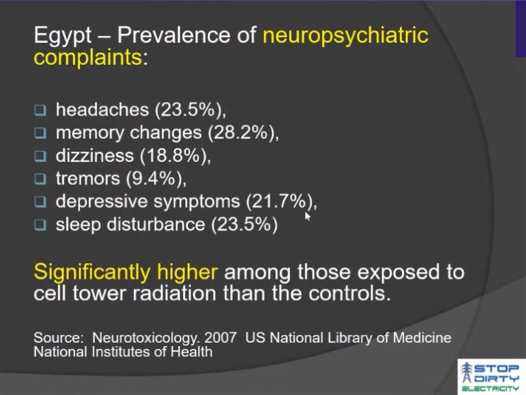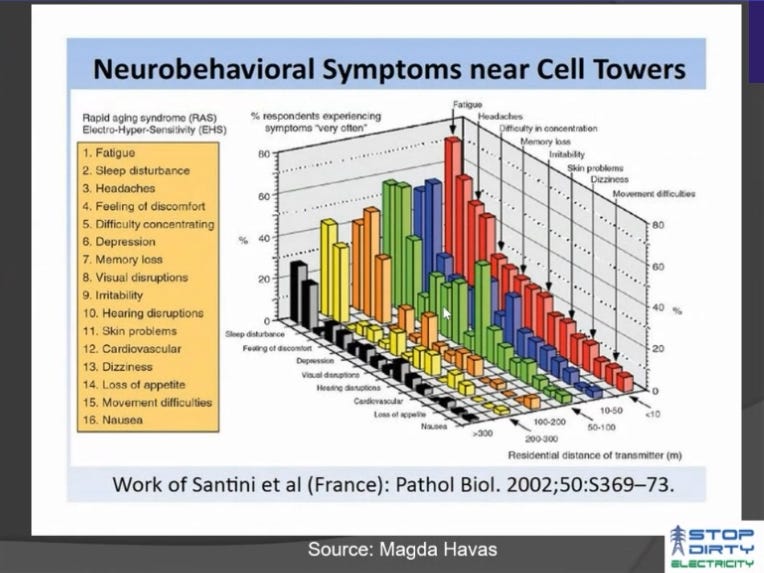 Symptoms like fatigue, sleep disturbance, headaches, feelings of discomfort, difficulty concentrating, depression, memory loss, irritability increase dramatically within 300 meters of a cell tower (Santini et al France: Pathol Biol. 2002;50:S369-73)