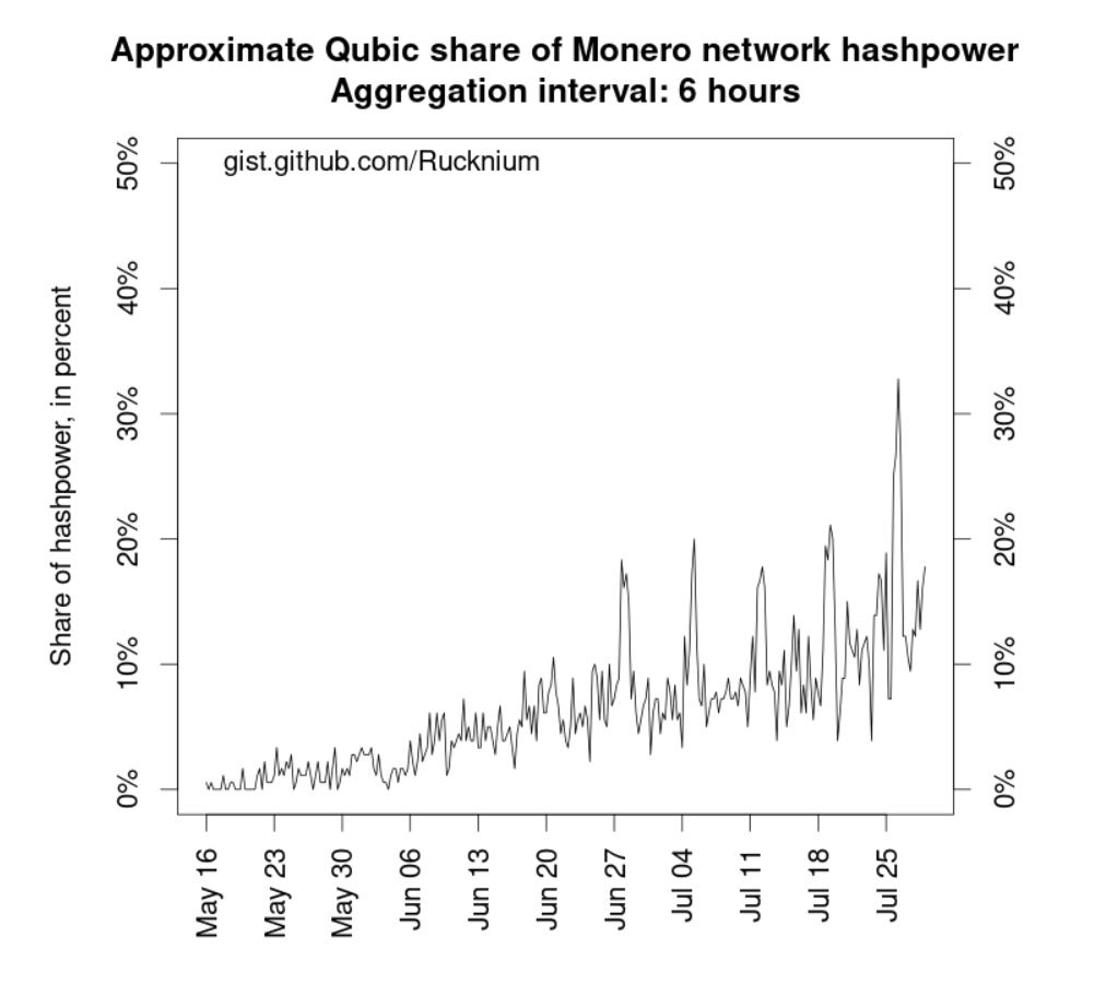 For example, if Qubic mined one block in a one-hour interval, then their approximate share of hashpower during that one hour is 1/30 = 3.3% because approximately one Monero block is mined every 2 minutes.