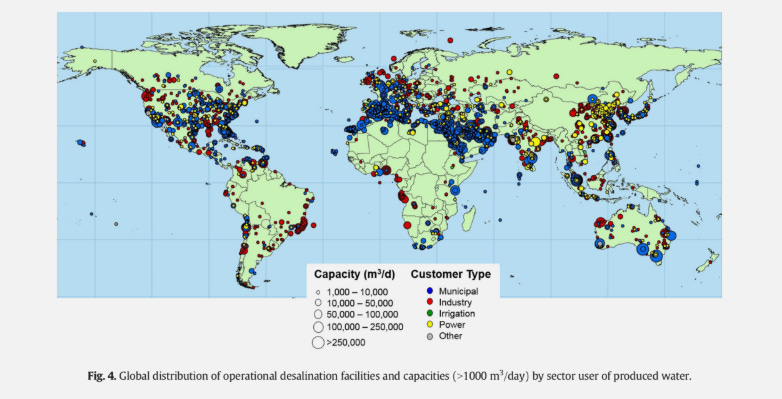 A study conducted in 2018 estimated about 16,000 operational desalination plants around the world, able to produce 95 million cubic meters of desalinated water per day.